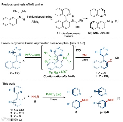 最近几年,不对称偶联反应取得了很大的发展,特别是在合成轴手性的双芳基化合物方面。然而,杂芳环-芳环的不对称直接交叉偶联仍然是一个巨大的挑战,尽管得到的杂双芳基化合物是一类很重要的手性配体。作为常规手性配体QUINAP的类似物,异喹啉胺萘(IAN)的研究却很少,原因在于它们较难合成,通常需要手性辅基诱导,再进行柱层析分离,尚未实现商业化。简而言之,缺乏实际可行的合成方法限制了IAN类配体的结构多样性及其进一步应用。西班牙CSIC-US化学研究所(IIQ)的José M. Lassaletta等人鉴于IAN等轴手性杂环双齿配体的应用潜力,发展了杂双芳环亲电试剂的动态动力学Buchwald-Hartwig氨化反应高效合成轴手性的IAN类二胺化合物(Scheme 1)。(Synthesis of IAN-type N,N-Ligands via Dynamic Kinetic Asymmetric Buchwald-Hartwig Amination. J. Am. Chem. Soc., 2016, 138, 12053-12056, DOI: 10.1021/jacs.6b07972)