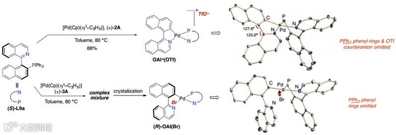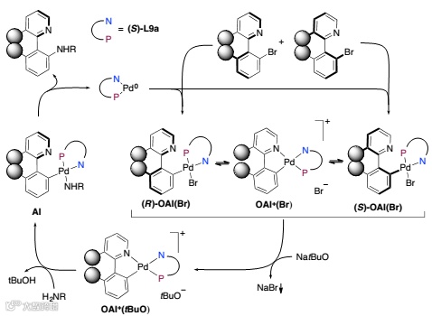 作者给出了可能的机理(Scheme 4),在机理中,叔丁醇钠除了作为碱,还起到溴代物除去剂的作用。为了证明这种假设的,作者尝试了分离底物2A(三氟甲磺酸酯)和3A(溴代物)的氧化加成中间体(Scheme 5)。等摩尔的配体L9a,底物2A和Pd(Cp)(allyl)反应,以88%的收率得到阳离子中间体OAI+(OTf),单晶显示为五元环Pd中间体。将这个络合物和苯胺,碳酸铯于50 ℃下反应7h顺利得到R构型的6Aa产物。用同样的方法制备OAI+(Br),粗产物1H-NMR 和31P NMR显示其是一个复杂的混合物,从信号中可以看出OAI+(Br)的存在。该混合物和苯胺的计量反应以定量的产率得到R构型的6Aa产物。作者从混合物中分离出了中性中间体OAI(Br)。作者给出的假设是:在叔丁醇钠的参与下,溴化钠的低溶解性促使了Br–和tBuO–的配体交换,此外tBuO–的弱配位性和大体积有利于阳离子中间体OAI+(tBuO)形成。OAI+(tBuO)中间体应该类似于OAI+(OTf),这可以从催化的立体结果看出来。