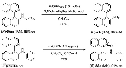 为了证明该方法的重要性,作者还进行了一些具有代表性的转化(Scheme 3)。产物6Am在Pd(PPh3)4的催化下脱烯丙基得到无取代的IAN,转化过程中不会发生消旋。值得注意的是,产物6Aa氧化得到的N-氧化物也是一类很重要的配体。
