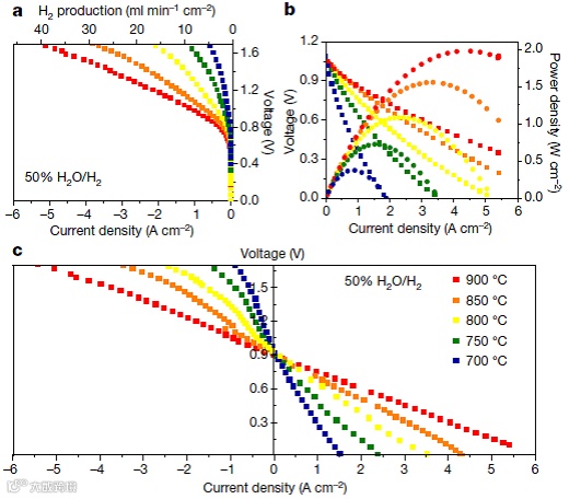 “电化学开关”不但表示通过电化学极化溶出的方法制备的催化剂,同时还意味着在700度~900度之间,固体氧化物可以实现SOEC和SOFC的切换。研究者将其应用于SOFC模式下,催化性能(1.3 W/cm2)比之前报道的催化剂(0.2 W/cm2)提高了近7倍。