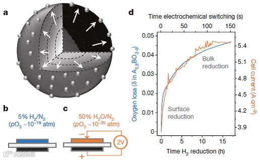 近日,英国圣安德鲁斯大学的Jae-ha Myung、Dragos Neagu、David N. Miller、John T. S. Irvine在Nature上发表文章,通过电化学极化溶出的方法制备的催化剂,大大缩短了之前报道的氧化还原溶出的方法所需的时间。同时催化剂性能更加优异,通过调节电压可以实现可逆过程,作者称之为“电化学开关”。(Switching on electrocatalytic activity in solid oxide cells. Nature, 2016, 537, 528-531, DOI: 10.1038/nature19090)