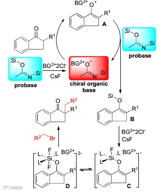 作者根据催化结果和潜在碱的角色研究,提出了如Figure 5的机理。从机理中可以清楚地看出潜在碱的角色,高价硅中间体C和D决定了反应的对映面选择性。