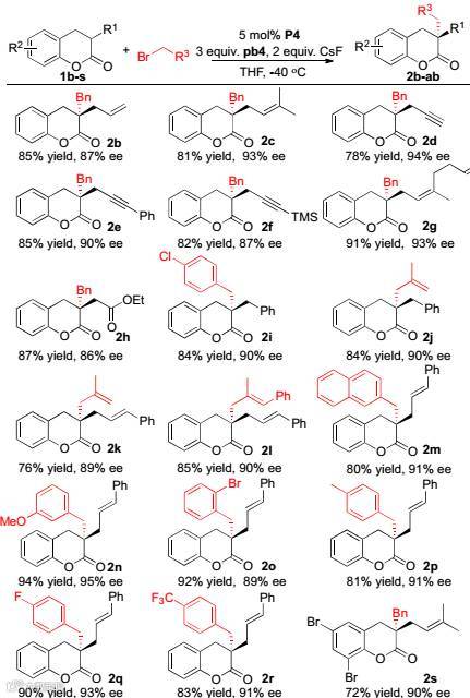 作者对底物1a进行了考察,首先筛选了一系列的手性胍盐催化剂和潜在碱(Figure 3)。最后发现催化剂P4和潜在碱pb4是最好的组合。从底物的拓展中我们可以看到,该催化体系普适性非常好,对各种取代基都有良好的包容性、产率(76%-94%)和对映选择性(85%-96%)非常优秀(Scheme 1)。