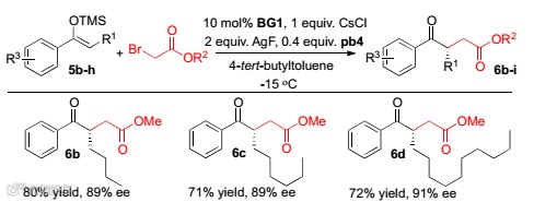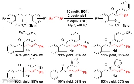 对苯并茚酮系列,BG1、pb5、氟化铯和乙醚是最佳反应条件。对烯基硅醚系列,BG1、pb4、氟化银、氯化铯和4-叔丁基甲苯是最佳反应条件。在最佳反应条件下,两个系列的催化结果也非常优秀,产率和对映选择性最高都可以达到99%(Scheme 2 and Scheme 3)。