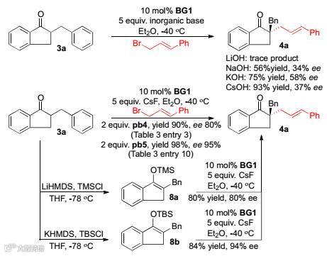 本文作者为了证明潜在碱在反应中体现出的优势和在反应中扮演的角色,以pb4和苯并茚酮3a作为研究对象(Scheme 4)。首先,作者对比一系列常见的无机碱,催化结果都比较差,这体现了潜在碱的优势。此外,作者首先把底物3a转化为硅醚,在催化剂存在下得到的结果与直接在潜在碱存在下得到结果类似,这间接证明了潜在碱不仅仅是作为一个碱的角色,还参与了中间体硅醚的合成。