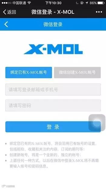 • 绑定已有X-MOL账号:如果您之前已经在X-MOL网站上注册过,您可以将自己的微信信息与您在X-MOL的注册账户绑定,这样以后通过微信自动登录进入的账户会沿用您之前账户的所有信息,包括收藏和关注的内容和设置。具体操作,在下图所示的页面填写您原有X-MOL账号的登录邮箱/手机号和密码,之后点击“登录”;