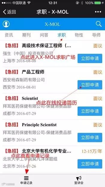 • 投递简历,申请职位:X-MOL求职广场为您精挑细选出化学、生物医药类的职位,登录后可直接在线投递简历,求职季助您胜人一筹! X-MOL的PC版已经支持简历编辑和导入(从51job和智联招聘导出的版本),手机版将于9/1日起支持手机填写和编辑简历。