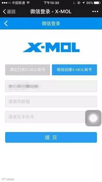 • 微信创建X-MOL账号:无论您之前是否已经在X-MOL注册过,这个操作都会创建一个新的、独立的X-MOL账号。具体操作,在下图所示页面填写相关信息。请注意,昵称可以更改,邮箱和手机号选填一个即可,点击“提交”。