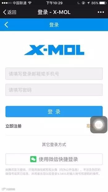 在微信中,您可使用微信快捷登录X-MOL平台。 微信登录由腾讯官方提供,只使用微信昵称和头像(均为公开信息),不涉及您的微信号或其它信息,可以放心使用。而且,可以省去您以后登录X-MOL时输入账号和密码的操作。您可以绑定已有X-MOL账号,或是创建新的X-MOL账号。