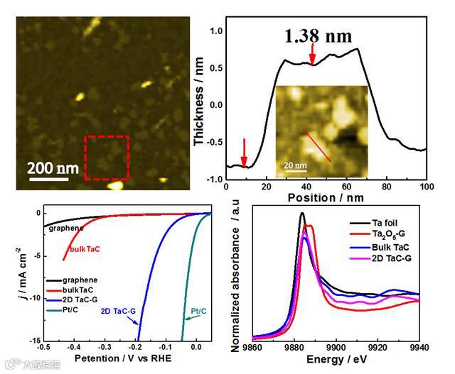 为了解决电解水制氢中非贵金属催化剂在酸性介质中活性低、稳定性不够的难题,陶举洲教授课题组的何春勇博士首次设计合成了一种负载在石墨烯表面上的二维TaC纳米片,并将其作为取代贵金属Pt的非贵金属催化剂应用于电解水制氢。这种二维TaC纳米片/石墨烯(TaC-G)复合催化剂的催化析氢起峰电位非常小,只有19 mV,和Pt非常接近,Tafel斜率只有58 mV dec-1。