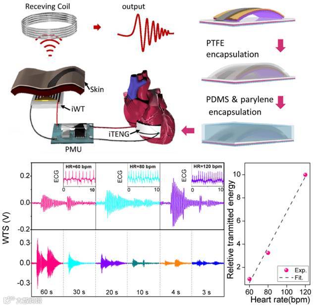 研究组成员还建立了iTENG输出能量与心率的关联性,并基于此设计制造了植入式自驱动心脏监控装置,可通过无线发射装置实现了自驱动的心率远程实时监控。该结果对于发展基于摩擦纳米发电机的主动传感+系统具有重大意义。