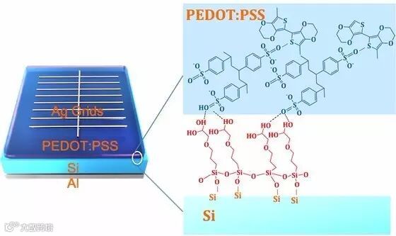 苏州大学功能纳米与软物质研究院(FUNSOM)孙宝全教授课题组,利用具有高透明度、高导电率的高分子导电聚合物3,4-乙撑二氧噻吩/聚苯乙烯磺酸盐(PEDOT:PSS),与具有表面减反结构的n型硅(n-Si)结合形成了硅-有机异质结太阳能电池,通过提高有机-硅异质结的质量,实现了效率超过14%的有机-无机异质结太阳能电池。该课题组通过利用硅烷偶联剂γ-(甲基丙烯酰氧)丙基三甲氧基硅烷(GOPS)来化学交联有机共轭高分子PEDOT:PSS薄膜与硅,提高有机-硅异质结的质量。有机-硅界面的化学交联有两个主要优点:(1)化学交联可以让有机分子与硅形成共价化学键,增强了有机-硅两者的结合力;同时避免了在有机-硅之间产生微气孔,从而改善了聚合物薄膜与结构硅的接触质量,(2)GOPS分子可以与硅表面的悬空键共价结合,大幅度降低表面的界面态,这样可以有效降低硅表面的复合速率,提高了界面处的载流子传输。这一简单的交联方法,有效的提高了无机-有机界面的电荷传输,为高效、低功耗、低成本光电子器件的制备提供了新思路。