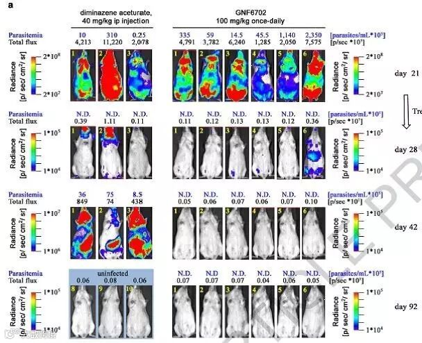 昏睡病:受血脑屏障的限制,仅有10%的药物进入脑组织。提高剂量至10倍,显而易见地清除了血液中的寄生虫,治疗7天后,也可持续清除寄生虫。在实验结束时,没有在大脑中检测到寄生虫,这优于三氮脒的治疗效果,如图8。