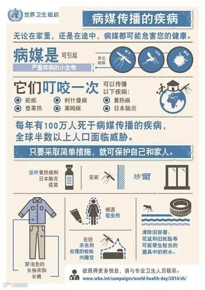 湿热环境蚊虫多多,保持环境卫生、在室内外喷洒杀虫剂、蚊帐(想想里约奥运中大火特火的“中国结界”)、穿上保护性的衣服等等都能有效预防。看文字不如看图直观,一起来看看WHO的宣传海报吧~~