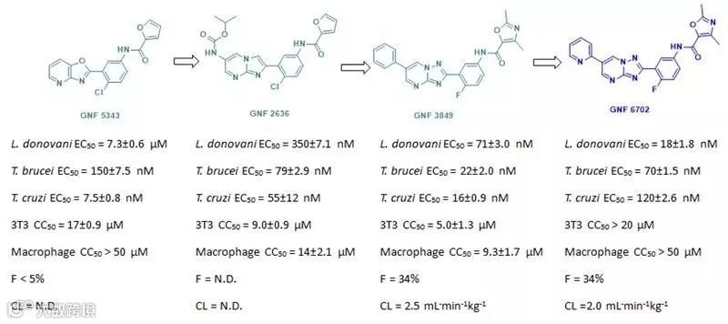 基于这种假设,Supek等人以半最大效应浓度EC50 < 10 μM且哺乳动物细胞选择性大于5为要求,筛选了三百万个化合物,最终发现吡啶并噁唑类化合物GNF5343对克氏锥虫和布氏锥虫有效。但它抗利什曼原虫活性稍差,生物利用度小于5%。随后,他们以GNF5343为先导化合物进行结构优化,合成了约3000个化合物。采用经典的结构修饰方法,用C6-取代的咪唑环和三唑环代替原来的噁唑环,药效提高了20倍(GNF2636)。二甲基噁唑取代呋喃,能减少呋喃带来的毒性;氟化苯代替氯化苯,提高了对哺乳细胞生长抑制的选择性(GNF3849)。通过结构优化,提高了生物利用度,并且血浆清除率也令人满意。在C6位置上继续改造,最终得到了化合物GNF6702,它的抗利什曼原虫活性是先导化合物GNF5343的400倍。