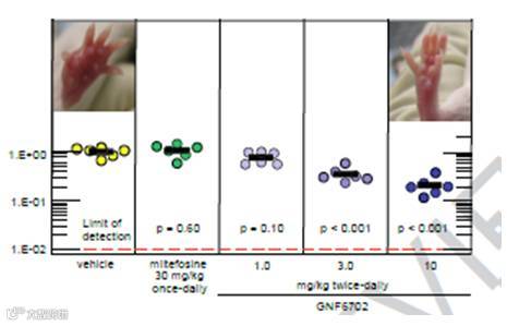内脏利什曼病:被利什曼原虫感染的小鼠,每天喂养两次10mg/kg剂量的GNF6702后,肝脏里的原虫明显减少,与唯一的口服抗利什曼原虫临床物miltefosine米替福新(2014年获FDA批准)相比效果更好。