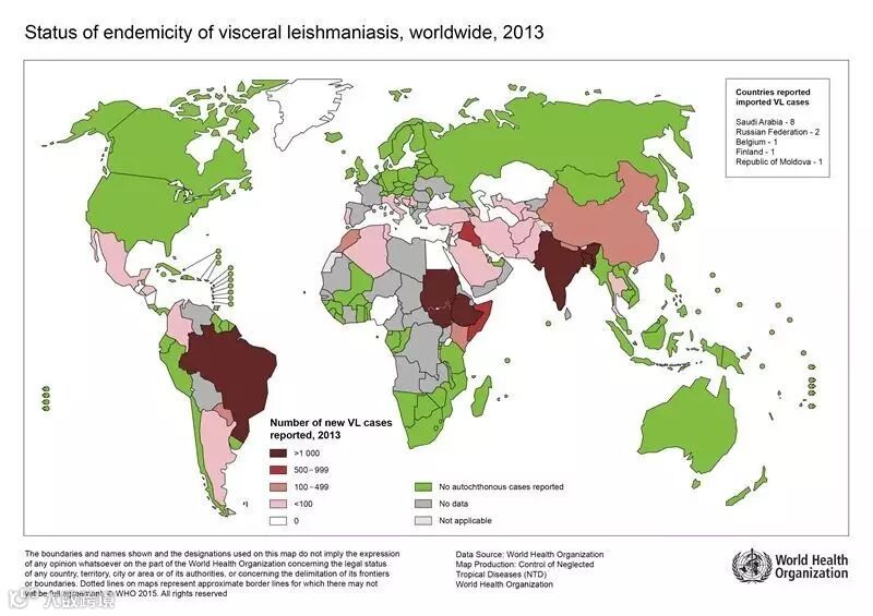 图2. 2013年全球内脏利什曼病分布图。图片来源:WHO