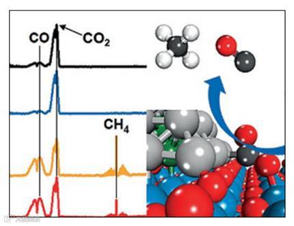 近日,美国哥伦比亚大学(Columbia University)、布鲁克海文国家实验室(Brookhaven National Laboratory)陈经广(Jingguang G. Chen)教授课题组报道了可还原性氧化物负载的铂-钴双金属催化剂可实现二氧化碳加氢产物选择性的调控。他们采用原位近大气压X射线光电子能谱(AP-XPS)、原位傅里叶红外光谱(FTIR)间歇釜、固定床流动反应器以及漫反射傅里叶红外光谱(DRIFTS)等技术详细研究了不同可还原性载体负载的铂-钴双金属催化剂对二氧化碳加氢产物选择性的影响。实验结果表明,二氧化钛负载的铂-钴双金属催化剂倾向于将二氧化碳还原为可进一步用于Fischer-Tropsch反应的一氧化碳;而二氧化锆或二氧化铈负载的催化剂则能够进一步将一氧化碳还原为甲烷,其中的关键中间产物甲氧基在AP-XPS实验中被证实。
