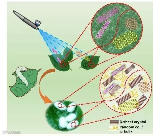 该项研究发现,给蚕喂食少量的碳纳米管或者石墨烯对蚕的生长和蚕茧的形貌没有明显影响;在蚕丝和蚕砂(蚕的排泄物)中均发现了碳纳米材料。作者认为,较低浓度的碳纳米管或者石墨烯可阻止在蚕丝成型过程中丝素蛋白分子中的无规线团结构向β-折叠结构的转化,从而使所获得蚕丝具有更高的延展性及韧性。但是,如果纳米碳材料的含量过高,会造成结块等缺陷,使蚕丝的力学性能降低。作者进一步将获得的蚕丝进行高温碳化处理,发现由于碳纳米管、石墨烯的模板诱导作用,使蚕丝在碳化过程石墨化程度提高,且获得的碳化纤维电导率显著提高。该研究提供了一种操作简单、环境友好、可大规模制取力学增强的改性蚕丝的方法,在超强材料开发、新型纺织品、可穿戴器件等领域具有潜在的应有价值。