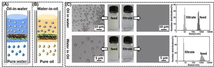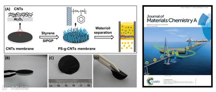 图1. (上)超疏水性PS/CNTs薄膜的制备以及分离油水乳液, (下)Janus 碳基薄膜分离油水乳液