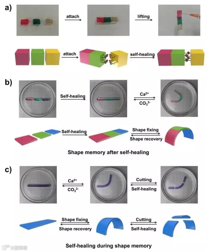 此外,动态硼酸酯键还可以赋予超分子水凝胶自修复性能。结合海藻酸-Ca2+的配位作用,他们实现了在自修复后进行形状记忆以及在形状记忆过程中进行自修复(图三)。这一思路有助于人们理解生物体的功能并设计构筑新型仿生材料。