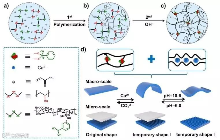 体系中存在动态硼酸酯键,海藻酸钠和金属离子(Ca2+)的配位作用两种超分子作用,这两种作用都可以作为临时交联点使水凝胶保持临时形状,从而实现形状记忆功能。鉴于这两种形状记忆方式互不干扰,将两者结合,则可以实现宏观/微观三重形状记忆功能(图二)。