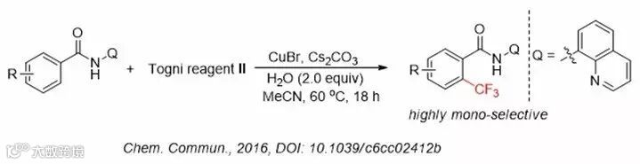 湖南大学的谭泽教授及浙江师范大学的朱刚国教授使用铜催化剂以及水作为添加剂,以8-氨基喹啉作为双齿导向基团,苯甲酰胺为底物,Togni reagent II 作为三氟甲基化试剂,在温和的条件下就可以通过碳-氢键的活化制备羰基邻位三氟甲基取代的苯甲酰胺衍生物。该反应是对余金权教授课题组发展的芳基碳氢键三氟甲基化催化体系的改进(Angew. Chem. Int. Ed., 2014, 53, 10439)。跟余教授所发展的方法相比较,此新方法具有高单三氟甲基化的特性。由于在反应中基本不产生双三氟甲基化产物,因此利于产物的分离纯化,同时反应拥有更广泛的官能团适用性。