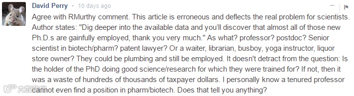 David Perry也赞同RMurthy的观点。他说,博士“能找到什么样的工作?教授、博后、生物技术/制药公司的高级科学家、专利律师?还是服务员、图书馆管理员、杂工、瑜伽教练、酒馆老板?如果是后者,他们也算是找到工作了,但问题依然存在:博士们找到的工作是否与他们研究生所受到的学术/科研训练有关?如果没有,那么就是浪费纳税人的钱……”