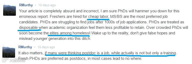 RMurthy的吐槽言辞犀利,直指“博后”这一博士“就业途径”,他认为博后不能算是一种正式工作,只能算是一种培训,甚至是一种“廉价劳动力”。当他们“没有什么利用价值之后,科研单位会毫不留情的将他们扫地出门”,就像是“一次性用品”那样。他开玩笑地说,博士们很快就会变成流浪汉中的精英了。他感叹道,“现实很骨感,快醒醒吧。别再抱着虚无缥缈的希望,别再误导年轻的一代,别让他们也掉进沟里。”