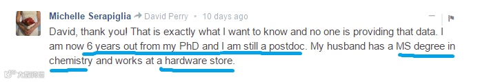 JonP、Julie Hoy和Michelle Serapiglia用自己的亲身经历来证明博士找工作有多么不容易。JonP以他的同事为例,有好几篇paper,在耶鲁大学和霍华德-休斯医学研究所完成了博后训练,现在在一个临床兽医实验室,挣得还不如他在公立学校做老师的老婆……他同样也吐槽了“博后”,认为博后不能算作正式工作,有“一万种理由将其排除在外”。Julie Hoy说她身边有人从顶级高校毕业,花了两年的时间才找到工作,还与科学研究没什么关系。Michelle Serapiglia说的是自己的经历,她拿到博士学位已经过去六年了,现在还在做博后,她的丈夫拥有化学硕士学位,现在在一家五金店工作。