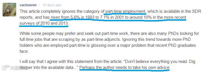 有多条评论直指这篇文章会误导读者,粉饰太平。一些人认为博士就业面临两个问题,找不找得到工作?找不找得到合适的工作?而后者可能更严重。这些评论批评的正是Mervis在文中所说的“大部分的博士生都找到了心仪的工作”(原文:“……almost all of those new Ph.D.s are gainfully employed……”)。
