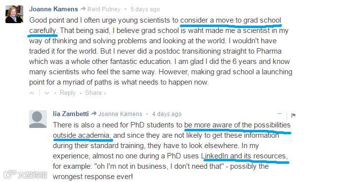 lia Zambetti也建议还在研究生院的博士生们能更多的接触学术研究之外的就业途径,提早做好准备。她举了个例子,她很少看到博士生们使用LinkedIn和相关的资源,他们经常会说,“我又不做商业,不需要这些”。