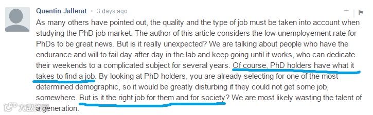 Quentin Jallerat也说,“博士是有超强耐力和意志力的一群人,他们可以日复一日的忍受实验失败,直到最终成功,也可以数年坚持周末也工作,只为一个复杂的课题。这样的人找到工作是理所当然的。但是,他们找到的工作是否适合他们自己?是否适合整个社会?不合适的工作是对一代人才能的浪费。”