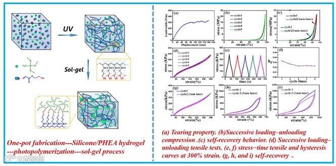 近日,北京化工大学朱晓群博士通过一锅法制备了一种具有高强度、高回弹性和快速恢复能力的双组份高分子水凝胶。该凝胶由两种水溶性良好而聚合方法不同的小分子单体——丙烯酸羟乙酯和三甲氧基硅烷,通过光聚合和溶胶-凝胶法串联聚合而形成双组份高分子水凝胶。丙烯酸羟乙酯光聚合形成第一高分子网络,三甲氧基硅烷经溶胶-凝胶水解聚合形成第二高分子网络。聚丙烯酸羟乙酯的羟基,可以在自身网络内以及网络之间形成氢键作用力,并且可与三甲氧基硅烷水解过程形成的羟基缩合,增强了两个高分子网络间的作用力;同时—Si—O—键柔顺且键能高,赋予了水凝胶良好的回弹性、韧性和快速恢复能力,在拉伸6倍或者压缩95%以上,极短时间内皆可恢复到原来状态。