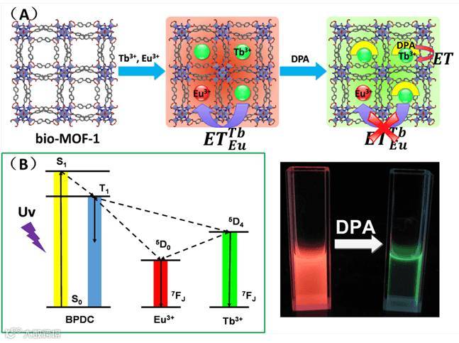 近日,中国科学院长春光学精密机械与物理研究所(长春光机所)李斌研究员和马和平助理研究员首次通过采用生物金属有机多孔骨架(bio-MOF-1)作为载体,通过离子交换制备Eu和Tb离子共掺的发光MOF。由于骨架中纳米孔的限制,Tb离子和Eu离子之间的距离限制在1纳米左右, Tb离子和Eu离子能发生高效的能量转移 (Tb到Eu的能量转移效率达到了89%),因此整个体系发红光。引入DPA分子后,DPA分子优先与Tb离子结合,会产生DPA到Tb离子的能量转移,同时发生在Tb和Eu之间的能量转移被阻断,使得整体体系发绿光。因此通过调节体系中能量传递的过程,研究团队实现了对DPA分子的比率荧光检测。