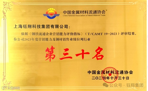 本次大会举行了“2023年度全国钢铁流通企业营销能力评价结果(五十强企业)发布与颁奖仪式”。上海钰翔科技集团有限公司荣获“2023年度营销能力及钢材销售业绩第三十名”荣誉。