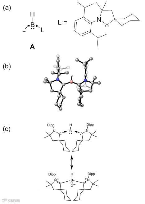 然而,聪明的化学家们总是想打破常规。在2011年,加州大学圣地亚哥分校的Bertrand教授报道了第一例路易斯碱性的三配位硼A(Figure 2a, Science, 2011, 333, 610-613)。在A的晶体结构中,硼原子和普通的三配位硼一样,具有一个平面三角形的构型(Figure 2b)。但是,由于硼原子周围特殊的卡宾配体,导致该化合物具有更多的共振形式(Figure 2c),从而具备反常的电子性质。