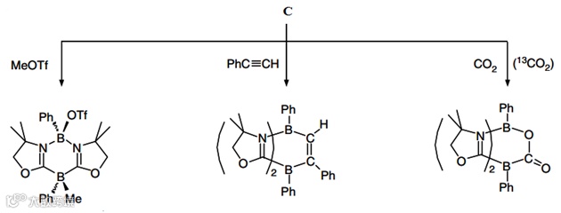 在2015年,Kinjo课题组设计合成了化合物C(Figure 6, Nat. Commun., 2015, 6, 7340)。该化合物同时具有传统上的路易斯酸性的三配位硼原子和打破常规的三配位路易斯碱性的硼原子,并且由于环张力的作用,使它们之间不能发生配位作用,从而显示出受阻路易斯酸碱对(Frustrated Lewis Pair, FLP)的反应活性。初步的研究表明,C可以和MeOTf、苯乙炔以及二氧化碳发生化学反应,生成相应的加合物(Figure 7)。