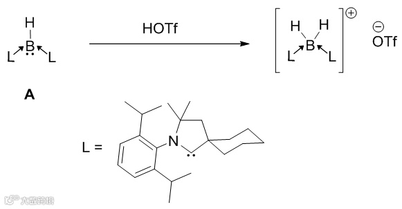 比如,向A中加入三氟甲磺酸(HOTf),A会被质子化,生成相应的盐(Figure 3)。这一反应充分的验证了A的路易斯碱性,打破了从中学到大学阶段教科书里对三配位硼的描述。美中不足的是,化合物A由于其周围位阻很大的卡宾配体,导致其中心硼原子很难与其他试剂发生反应(e.g. 对MeOTf无反应活性)。