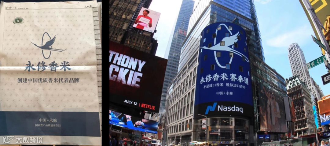 经过农本调研,我们发现国人一说“香米”,言必提“泰国香米”。在品牌创意时,我们推出了永修香米品牌广告口号“永修香米赛泰国”,并且在发布会前一天,6月17号,在《人民日报》整版发布了永修香米品牌广告,随后在美国纽约时代广场也投放了永修香米品牌广告。