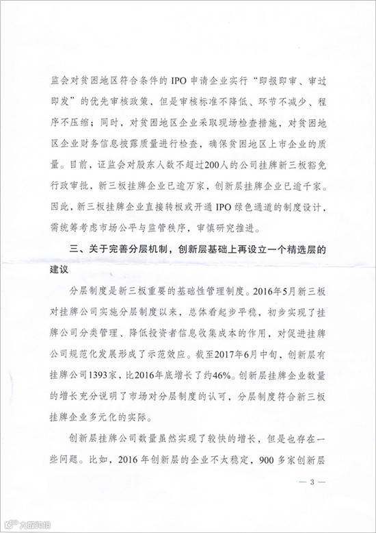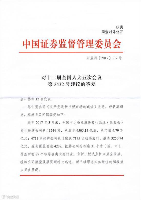 据了解,2017年两会期间,全国人大代表、圣泉集团董事长唐一林向大会提交了《关于发展新三板市场的建议》。唐一林主要提了三点建议,一是尽快明确“三类股东”作为拟首发上市(IPO)企业股东的合法资格的建议;二是尽快推出直接转变试点或IPO绿色通道的建议;三是关于完善分层机制,创新层基础上再设立一个精选层的建议。中国证监会以书面形式对以上建议一一作出了回应。