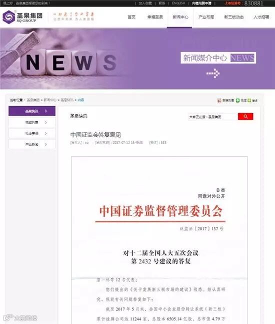 中国网财经7月13日讯 7月12日下午,圣泉集团(830881)官网发布了中国证监会对《关于发展新三板市场的建议》的答复文件。文件显示,中国证监会表示正积极研究“三类股东”作为拟上市企业股东的适格性问题。