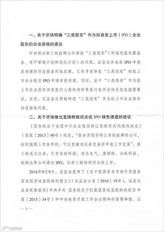 有关三类股东的建议,文件回应称,针对部分新三板挂牌公司存在“三类股东”的问题,中国证监会并未在IPO申请即受理阶段设置差别性政策,目前中国证监会正积极研究“三类股东”作为拟上市企业股东的适格性问题。