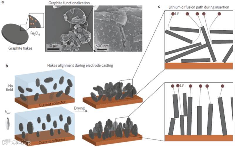 近日,瑞士苏黎世联邦理工学院(ZTH)André R. Studart和Claire Villevieille等人在Nature Energy杂志发表了一种提升锂离子电池性能的简单方法。研究者通过常规的超声震荡法,将很少的(0.3 vol%)具有磁性的Fe3O4纳米颗粒负载在石墨片层上。在磁场作用下,功能化后的石墨片层有序排列,再经过真空干燥便可以得到高性能的电极材料。石墨片层的这种有序排列,就像是古时候大队步兵列成战阵,整体“战斗力”迅速提升。(Magnetically aligned graphite electrodes for high-rate performance Li-ion batteries. Nature Energy, 2016, 1, 16097, DOI: 10.1038/nenergy.2016.97)