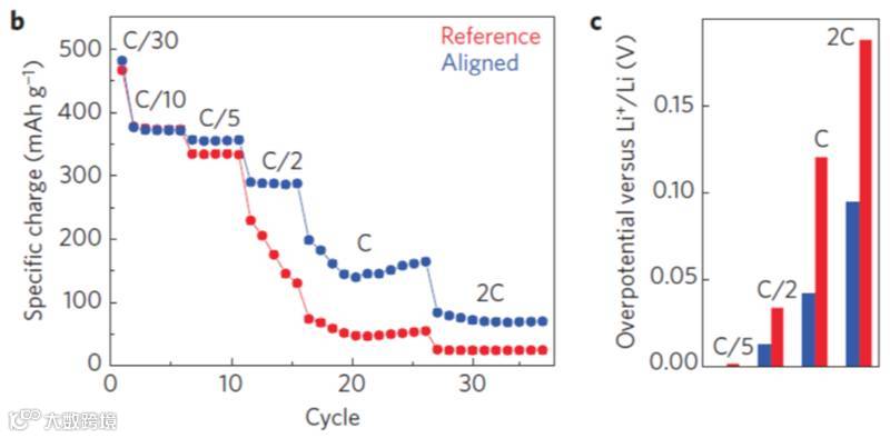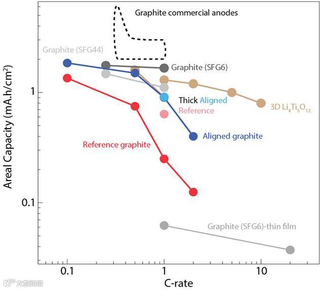 电化学测试表明,这种电极高倍率(1C)充放电性能可以达到传统非定向排列的石墨负极的3倍。更重要的是,这种方法给我们提供了一种有趣的思路,即不改变电极材料的化学组成,仅通过改电极的内部排列结构,也可以提高电池的电化学性能,而且非常有效。