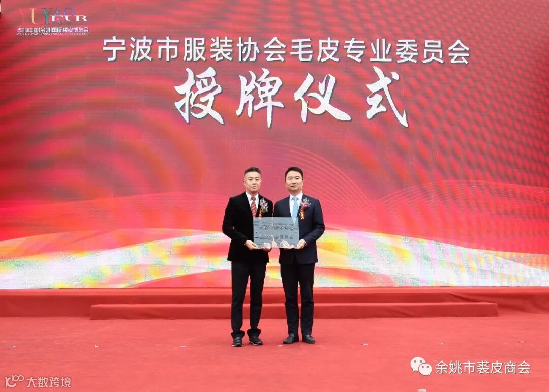 授牌仪式由宁波市服装协会会长胡纲高授牌,由宁波市服装协会毛皮专业委员会主任谢耀接牌。