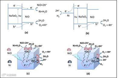 因此,在前期工作的基础上,中科院大连化物所的李灿院士、韩洪宪研究员及华南理工大学廖世军教授进一步研究了具有相同晶面性质的半导体晶体上光生电子和空穴的分离及其参与分解水的过程。他们选择了立方体NaTaO3作为等同晶面的半导体模型,NiO作为助催化剂,光催化分解水作为电荷分离效率的探针反应。晶体结构、光沉积位点、直至分解水反应,均验证了合成的NaTaO3晶体是六个晶面等同的李芳晶向结构。光沉积担载贵重金属和金属氧化物的表面电子和空穴位探针实验结果表明,含有等同晶面的NaTaO3没有类似用于BiVO4的晶面电荷分离现象。进一步研究发现,含有等同晶面的NaTaO3在担载NiO后能实现高效分解水,表明NiO担载对等同晶面上实现电荷分离起到关键的作用。反应前后的XPS和同步辐射XAS等谱图研究表名,在光催化水分解反应中,NiO担载的NaTaO3在同一晶面上同时存在还原位点和氧化位点,还原位点的NiO在光的作用下被电子还原的Ni,最终作为还原助催化剂,发生质子还原反应;而氧化位点的NiO作为氧化助催化剂,发生氧化水反应。在等同晶面条件下,光生电子和空穴是在Ni和NiO双助催化剂上得到分离,最终实现光催化分解水反应。