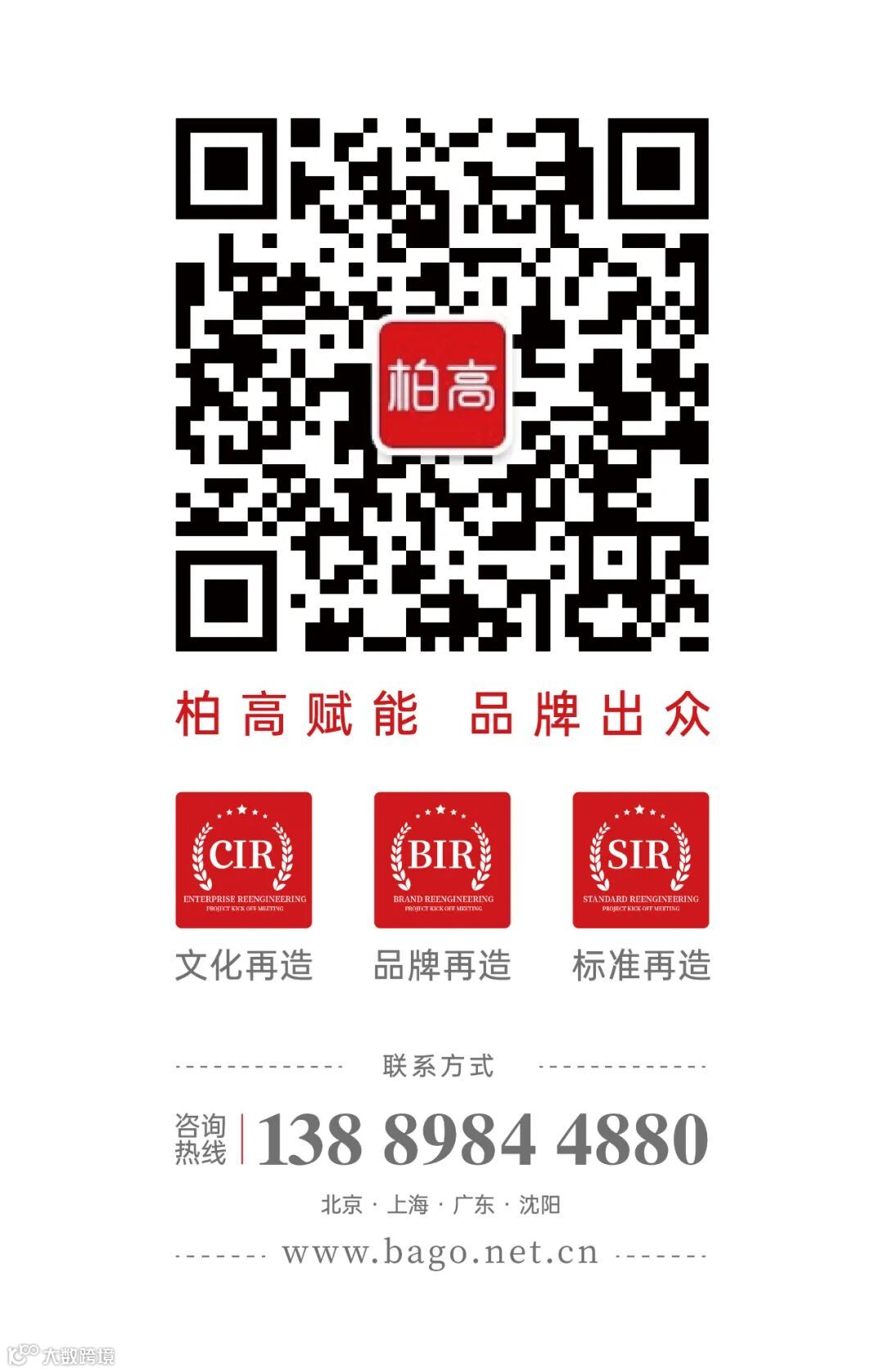 柏高中国成立18年来,服务2000多家优秀企业的实战经验,成功孵化100余家企业成为行业标杆品牌,实现品牌资产100%增值。公司的核心业务是打造行业标杆品牌全系统解决方案,为中国民营企业提供最具实效性的五大管理咨询服务体系,服务体系有品牌再造、企业再造、文化再造、标准再造、团队再造。为企业规划从300万到300亿的顶层设计路线图,推动企业实现规模化、品牌化、标准化、资本化转型,保障企业高质量可持续发展,打造强势民族品牌!