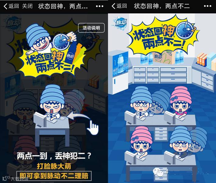 另一方面,#两点犯2#的话题讨论同样延续到了微信朋友圈中发酵。一篇从中医、西医、人类进化等多角度阐述两点容易犯二的常识帖获得了100000+的曝光。脉动更推出了一个“状态回神,两点不二”的H5打脸小游戏,入口即为产品瓶身二维码,此举成功将线上的话题声量转化为深度互动,拉进了和消费者的距离。参与游戏互动后的众多“不二好礼”设置,也进一步强化了“两点不二”诉求。