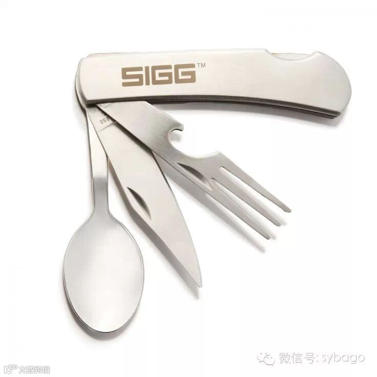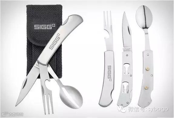 可以像小刀一样折叠的户外三件套餐具,手柄也能分成三部分,这样就能够分开使用这三件餐具。